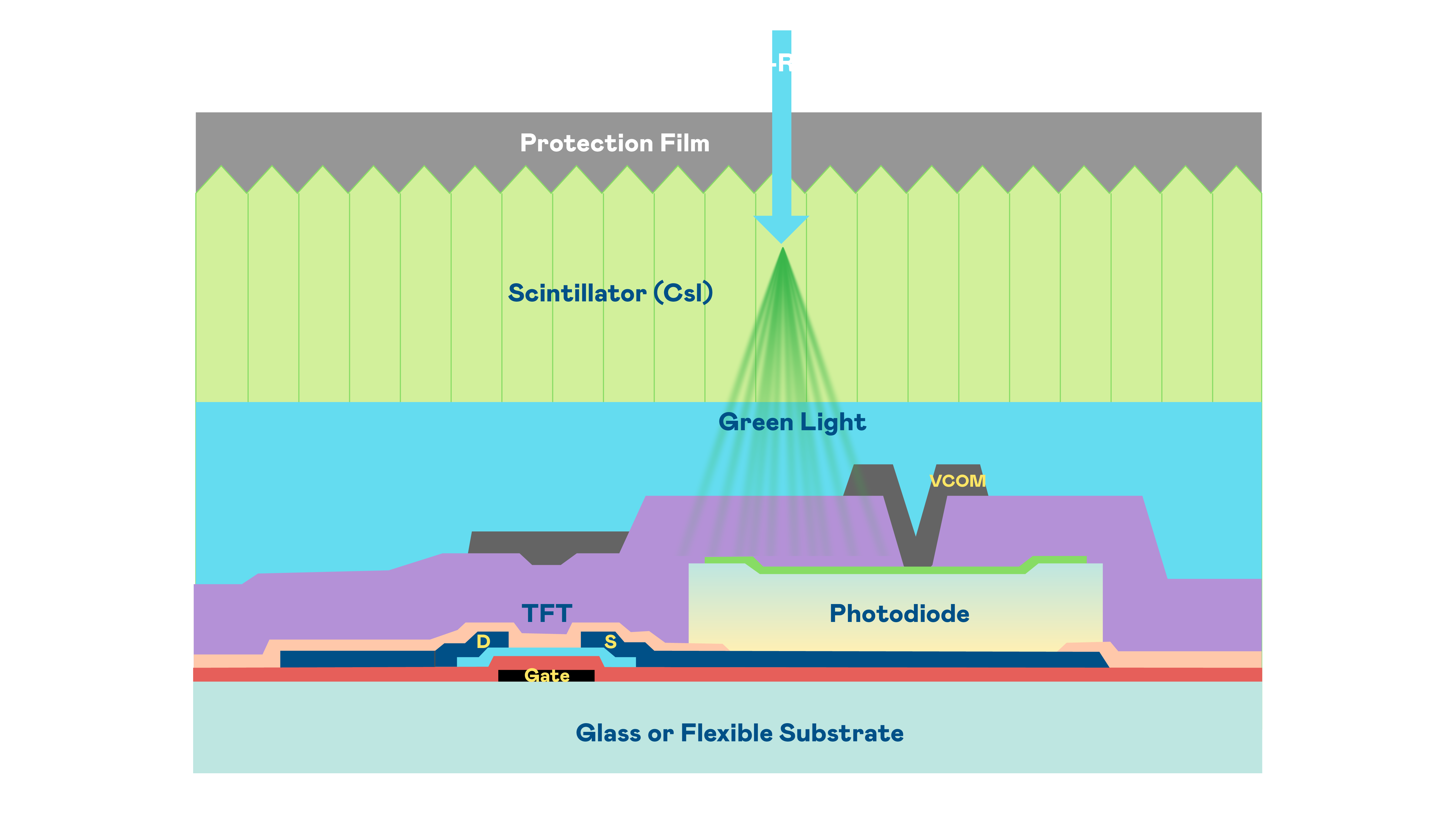 NG28电子的X光影像感测阵列使用薄膜电晶体 (TFT) 作为每个像素的读取开关,搭配光电二极体(Photodiode)的光电转换元件,用以感测X光影像讯号。